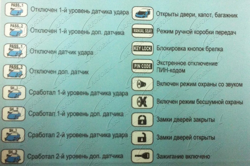 Купил машину с этой сигналкой. При каждом срабатывании тревоги ПКП оповещает об этом звуковым или вибросигналом, а на дисплее отображается соответствующий символ.