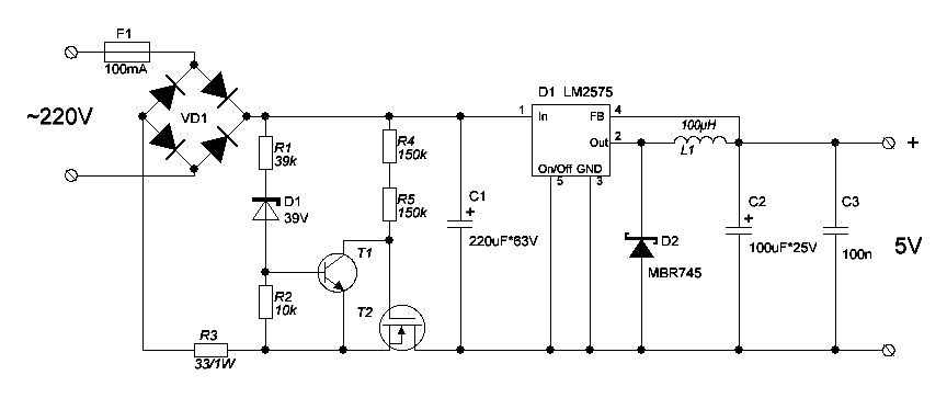 Это стандартная схема включения микросхемы LM 2576-ADJ. Конденсаторы С1 и С4 керамические 0,1 — 1 мкф, С2 — С3 электролитические 1000 мкф х 63В, можно установить один на 2000 — 4000мкф. С5 — С6 1000 мкф х 40в, тоже можно заменить одним конденсатором на 1000 — 2000 мкф.