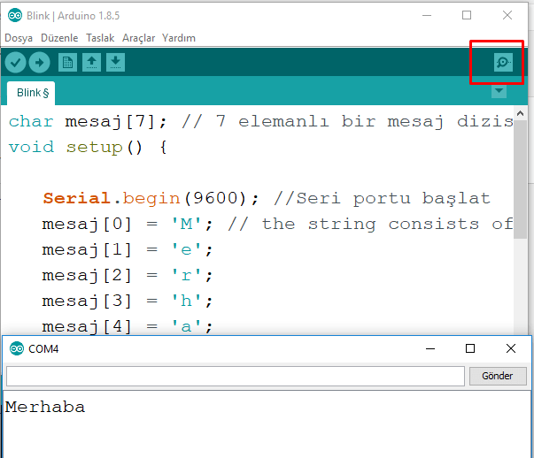 Монитор последовательного порта — это функция Arduino IDE, которая показывает нам информацию, отправленную с Arduino. Это полезно для отладки и для изучения того, какие значения выдает датчик или переменный резистор. Чтобы открыть Serial Monitor, нажмите кнопку в верхней части Arduino IDE.