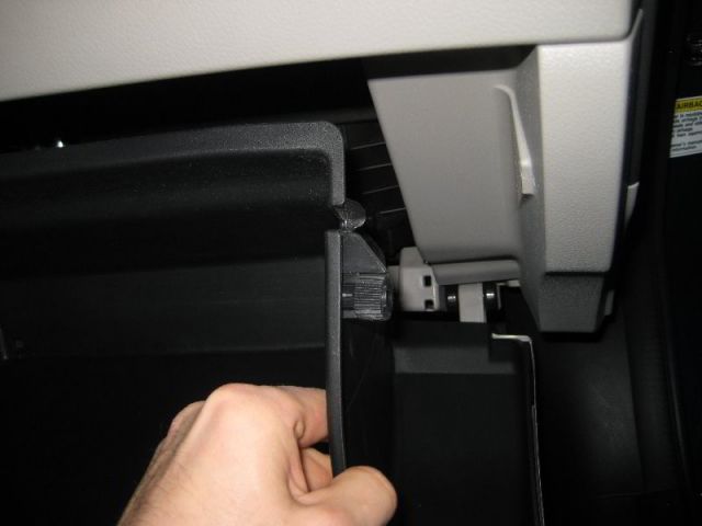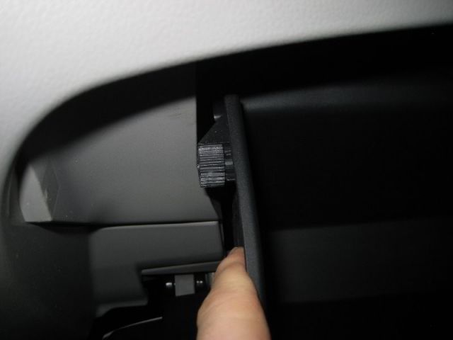 Садимся на переднее пассажирское место. Открываем бардачок, снимаем руками его боковой крепёж: