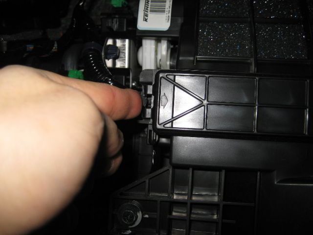 Откидываем бардачок вниз (он на шарнирах) и прямо видна кассета салонного фильтра. По краям кассеты с двух сторон нажимаем на защелку и выдвигаем кассету.